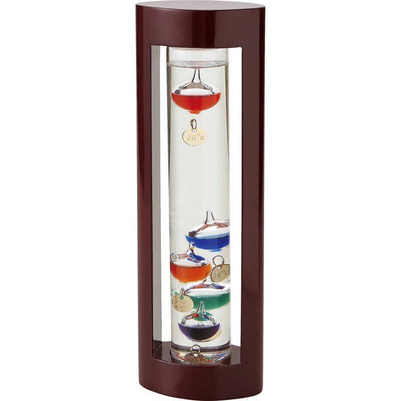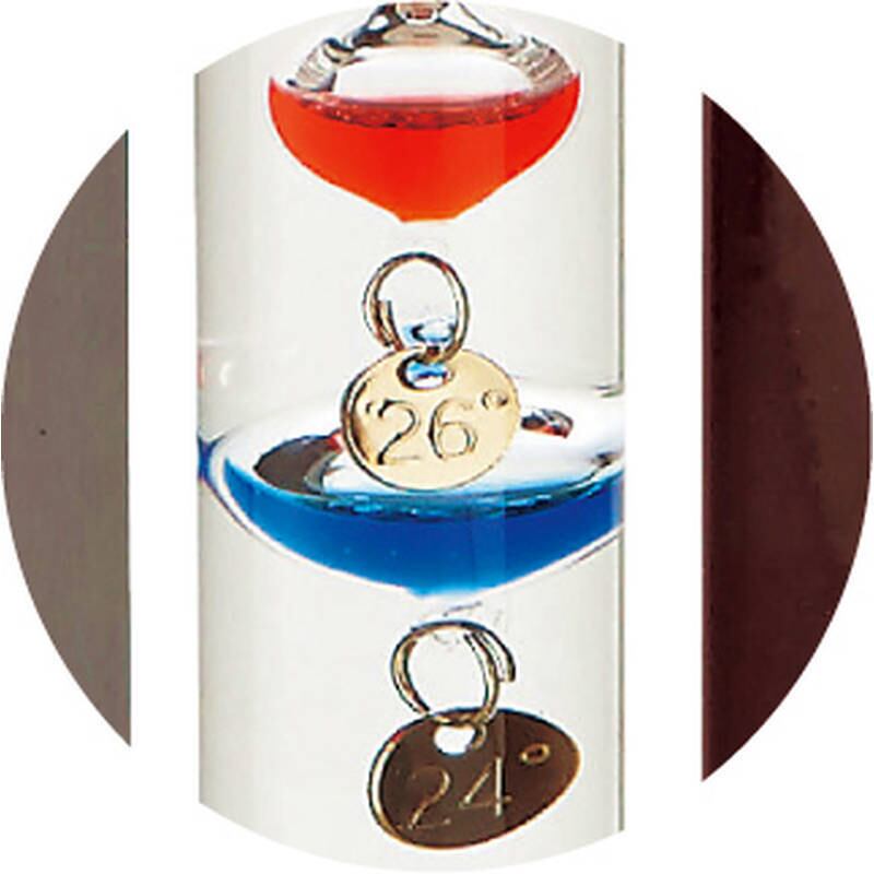 艶のある木枠がモダンで華やかな印象のインテリア温度計です。実際の気温は上層部に浮いているガラス球体に付いているプレートで読み取ります。・測定可能温度:18℃~26℃